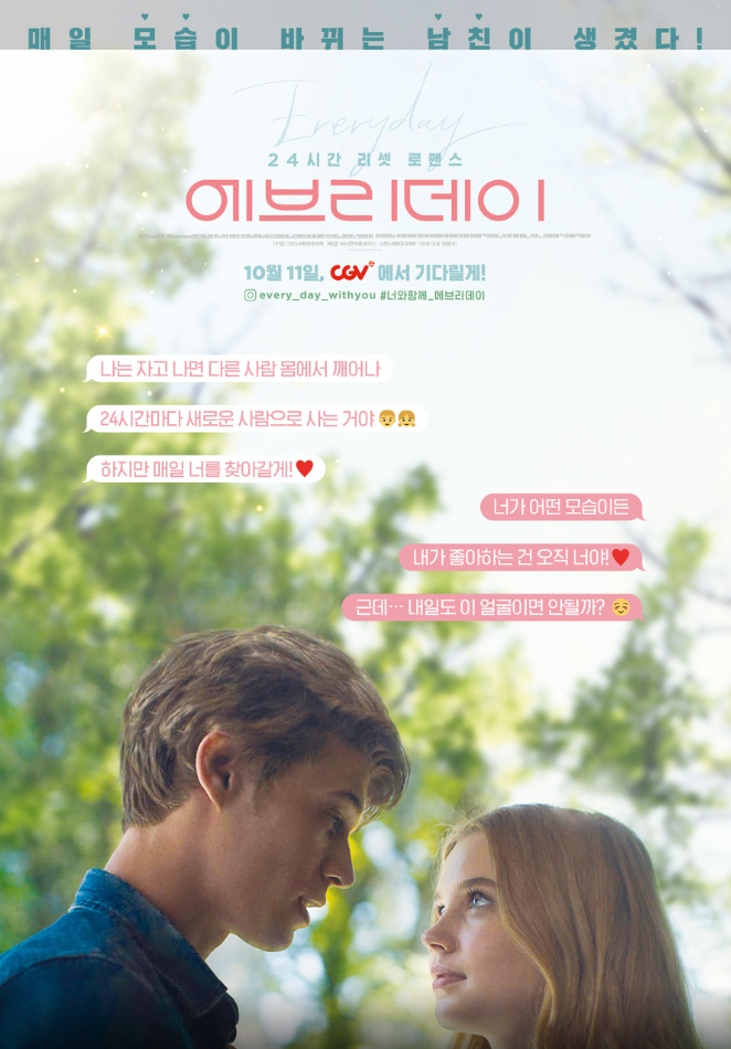 영화 <에브리데이>는 매일 다른 사람의 몸에서 깨어나는 주인공 '에이'와 그를 사랑하게 된 소녀 릴리의 특별한 사랑 이야기를 그린 작품이다. 독특한 설정을 바탕으로, 정체성과 사랑의 본질, 그리고 인간 관계의 복잡성을 탐구하며 관객에게 깊은 감동을 선사한다. 감독은 환상적인 소재를 현실적인 감정과 연결시켜, 사랑이 외적인 모습이나 신체를 넘어선다는 메시지를 전달한다. 본 리뷰에서는 영화의 주제 의식, 캐릭터 간의 관계, 그리고 연출적 완성도를 중점적으로 살펴보고자 한다.